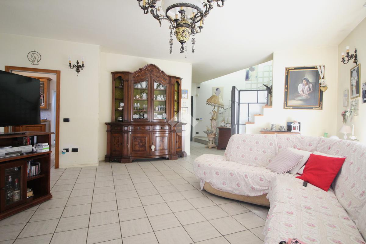 Ci accoglie, al piano terra nel primo ingresso, un'ampio e luminoso soggiorno con accesso al portico che affaccia sul giardino, la cucina abitabile servita da terrazzo ed un bagno di servizio.