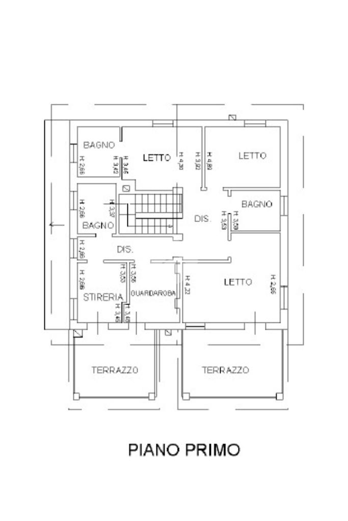 Al primo piano troviamo due camere matrimoniali di cui una con accesso al balcone e l'altra con bagno privato, tre camere singole, due delle quali hanno accesso allo stesso balcone. Servono il piano altri due bagni finestrati.